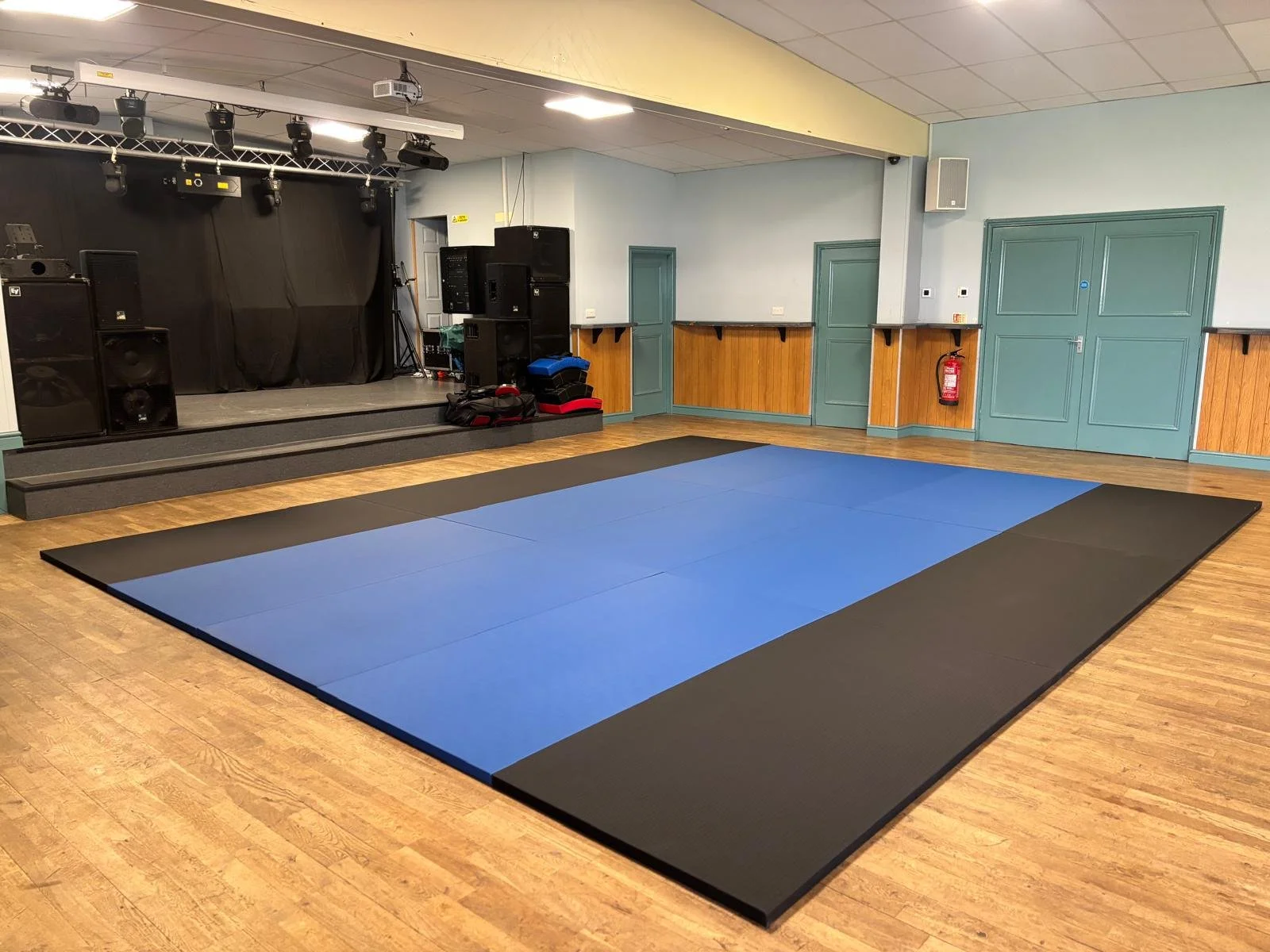 The facility has a wooden floor and can accommodate up to 60 students. There is a matted section for sweeping techniques and throws.